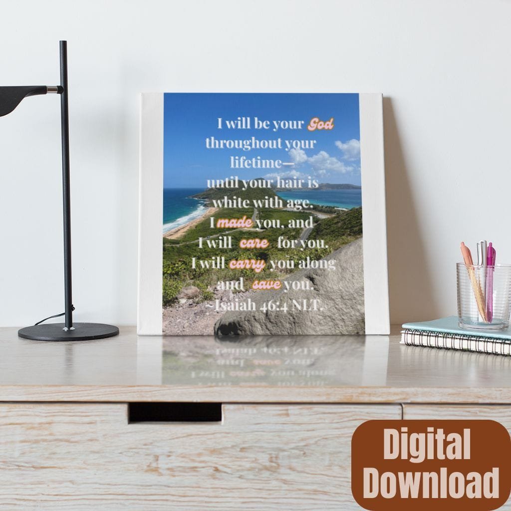 Isaiah 46:4 wall art is a beautiful and powerful way to bring God’s love into your home. This verse reminds you that God made you, He will carry you, and He will always be with you—even when you’re older. It’s more than just a picture; it’s a promise from God! You can download it fast, print it at home, and hang it anywhere to feel peace and hope every day. It’s easy to use, makes a great gift, and helps your heart feel strong. Let your walls speak God’s truth with this special artwork!